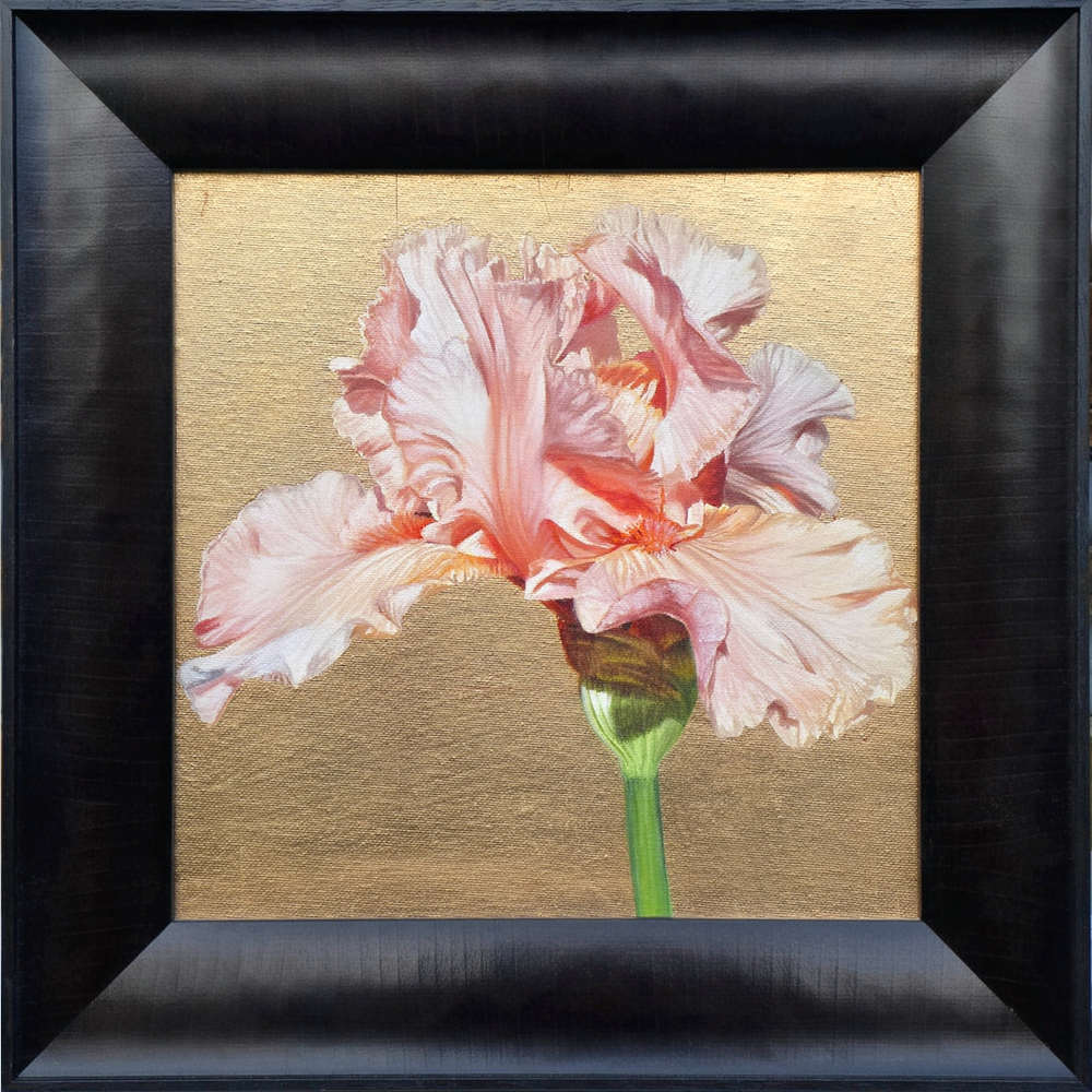 Peach bearded iris in bright sunshine on rose gold leaf background.