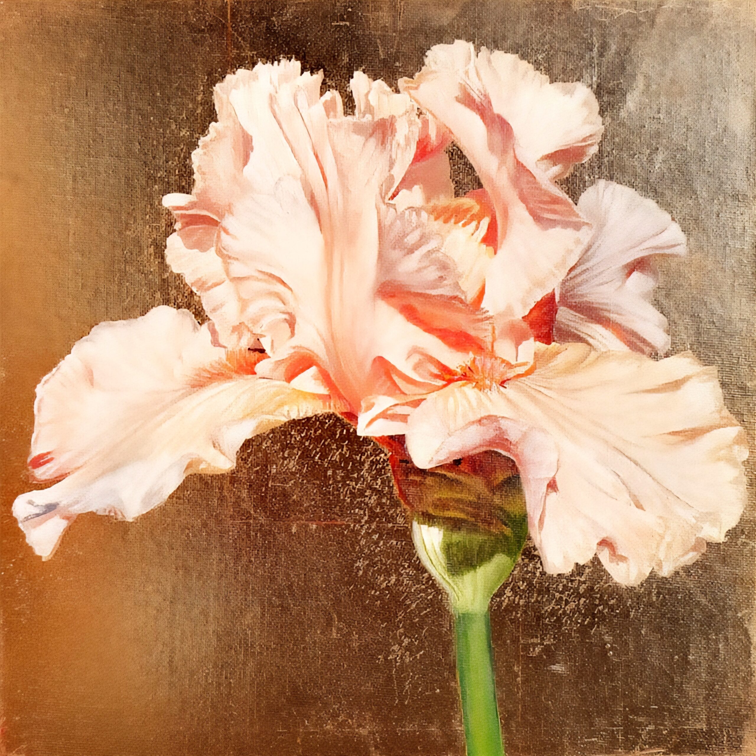 Peach bearded iris in bright sunshine on rose gold leaf background.
